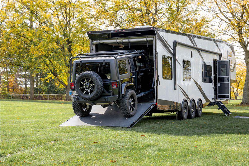 A travel trailer or fifth wheel with an integrated garage for ATVs, motorcycles, or snowmobiles. Popular in Western Canada. Financing follows the same parameters as the underlying trailer type. Loan amounts $30,000–$150,000.